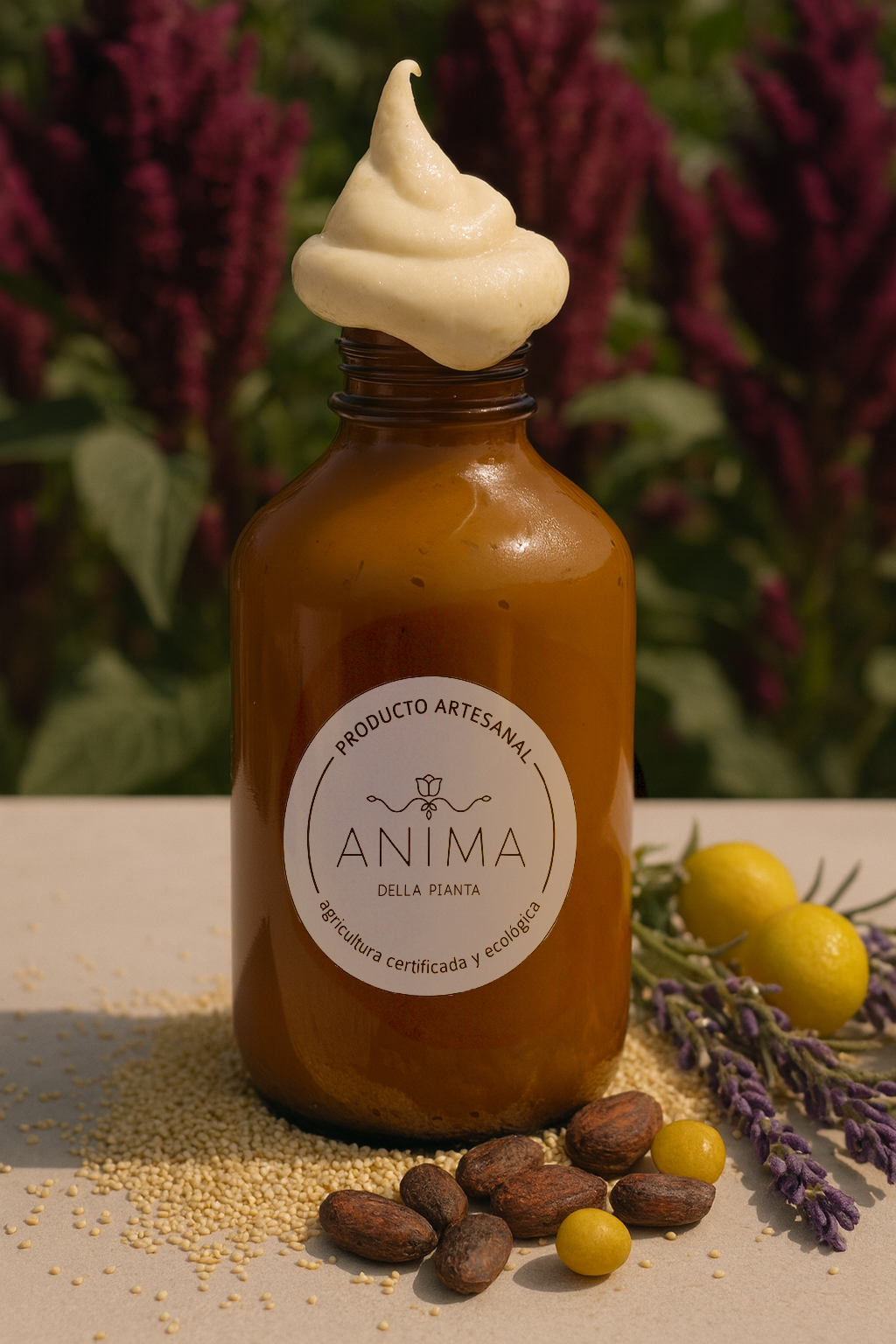 Crema de peinar- leave in, con péptidos de amaranto, ácido hialurónico, aceite de oliva virgen extra, aceite de coco y manteca de cacao.